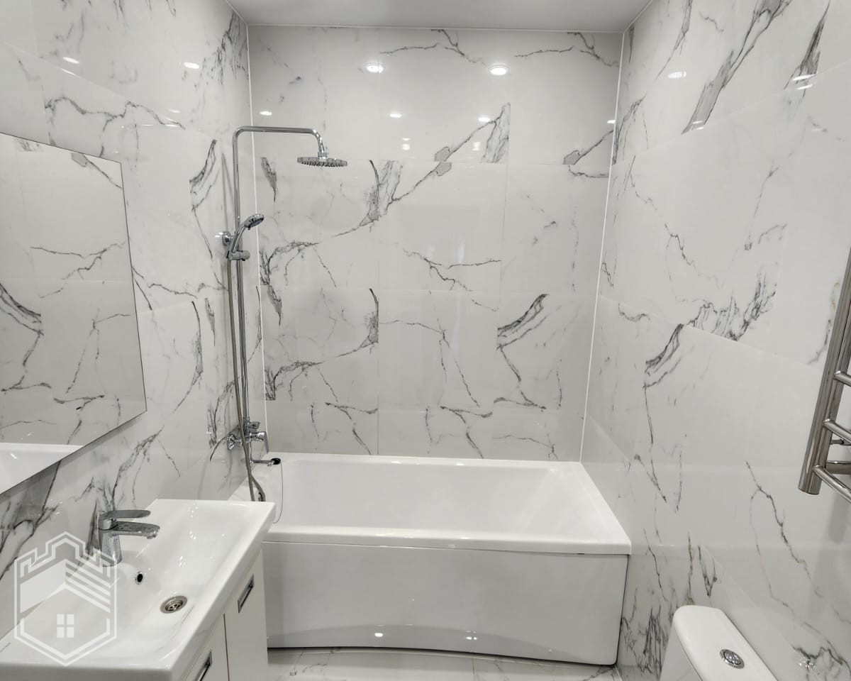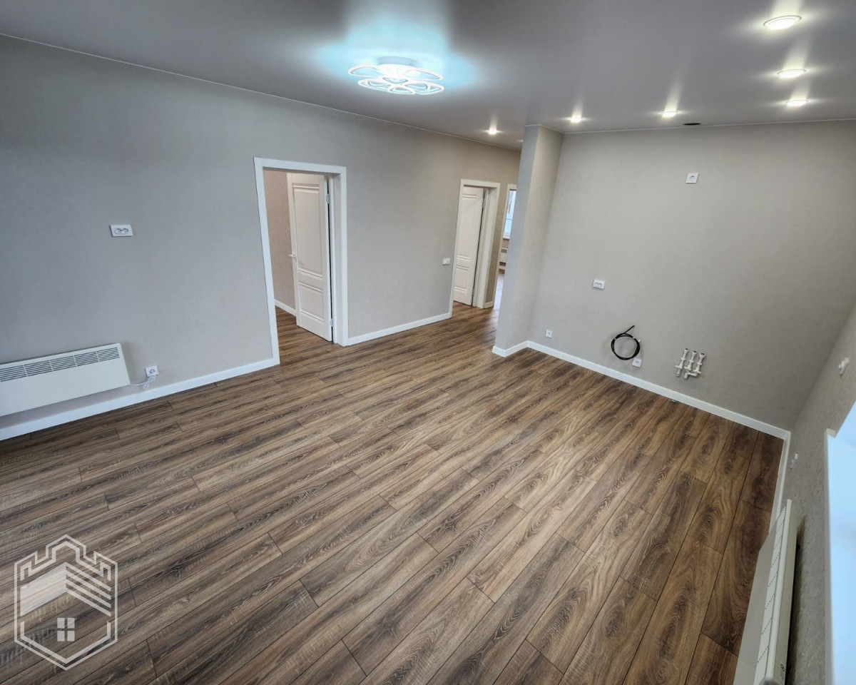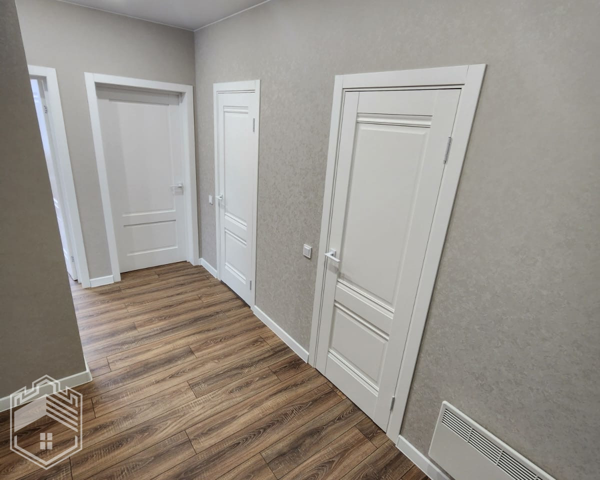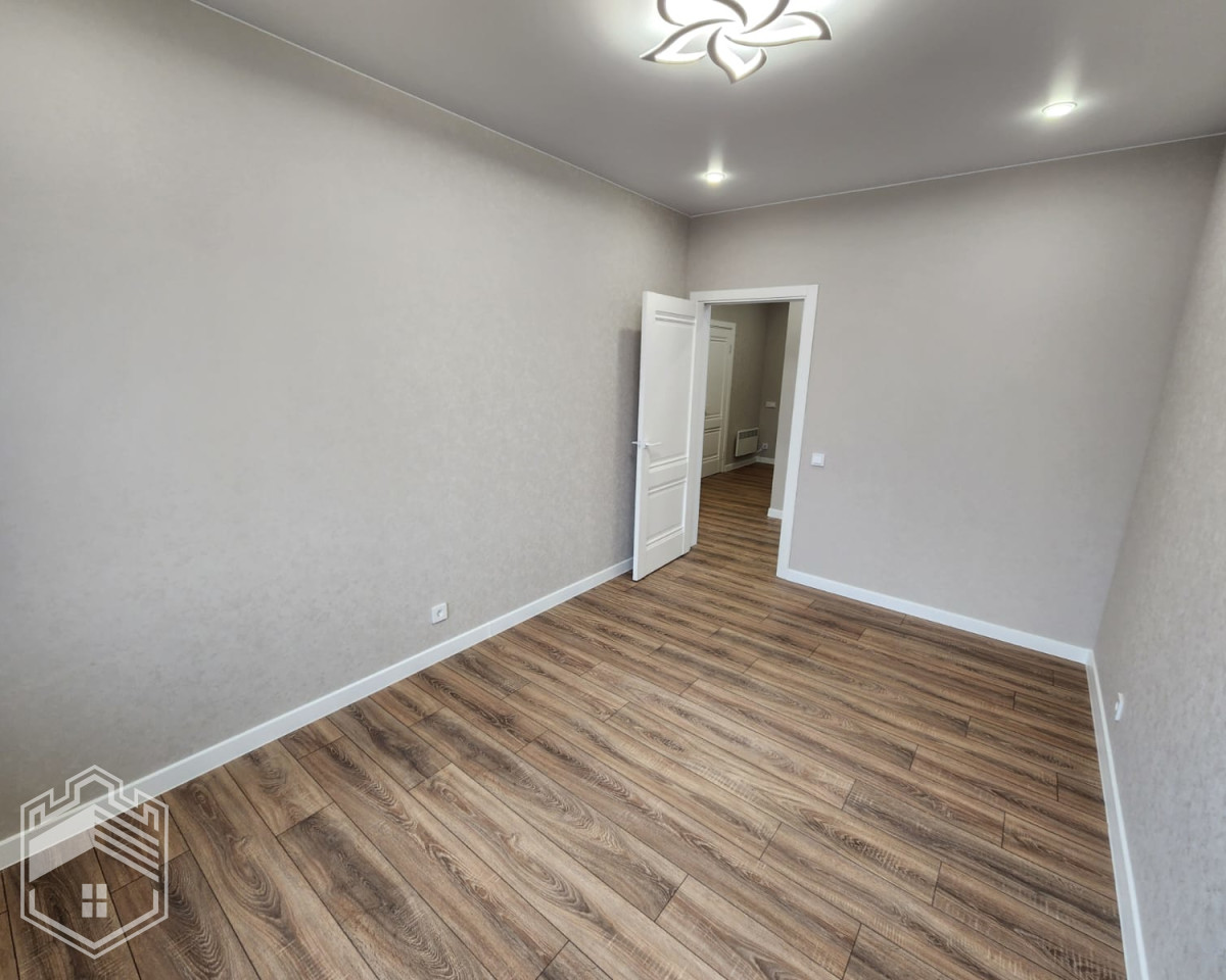 — Отделка: на пол уложен ламинат, на стенах — гипсокартон с поклейкой обоев, натяжной потолок, в с/у керамогранит, установлены унитаз, ванна, раковина, зеркало с подсветкой и полотенцесушитель.