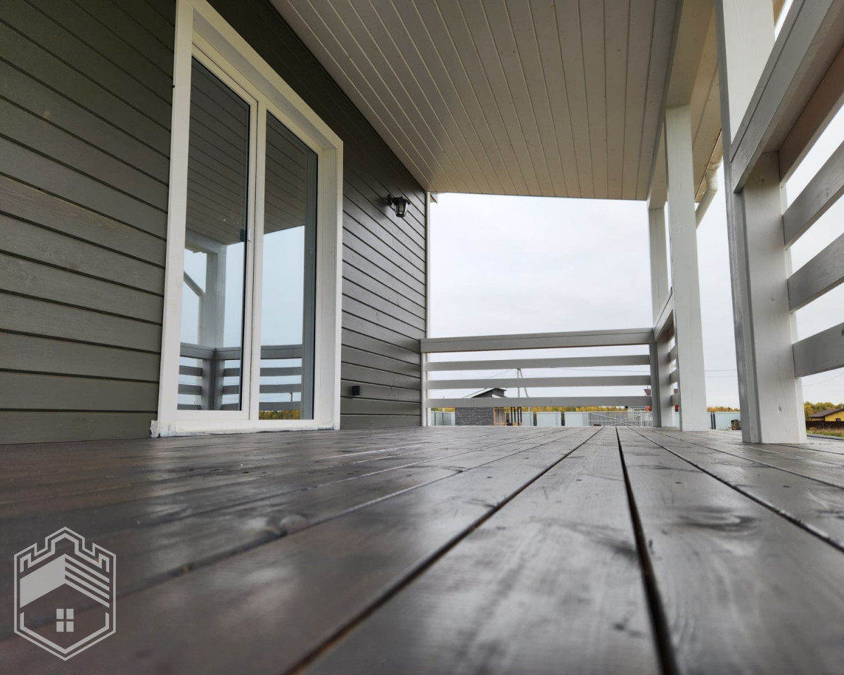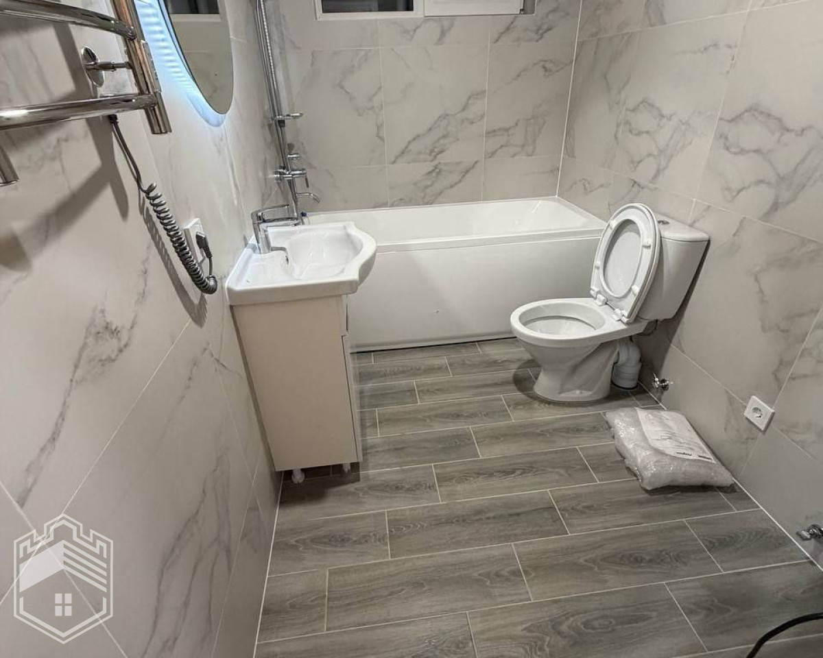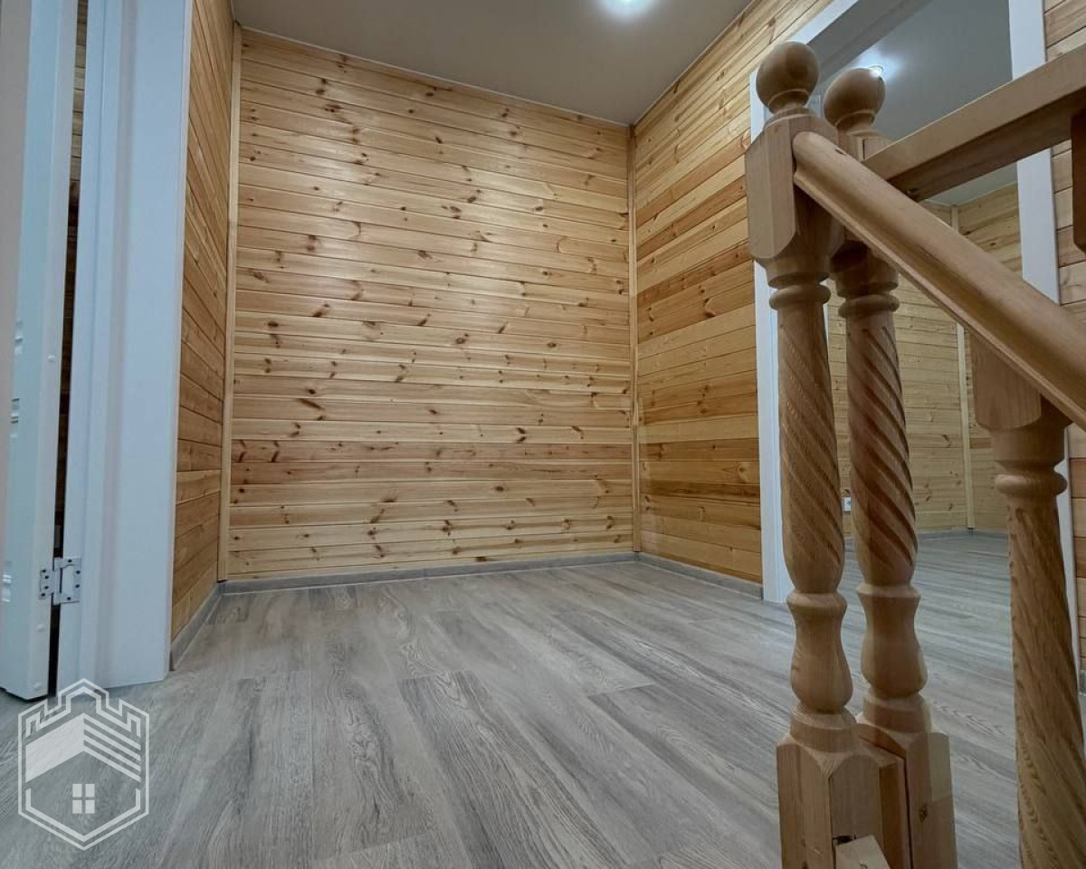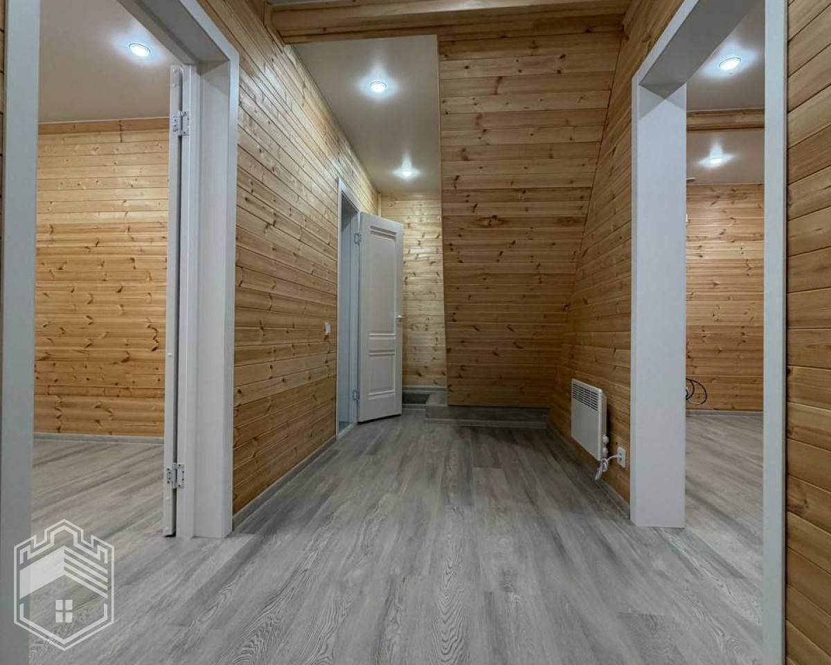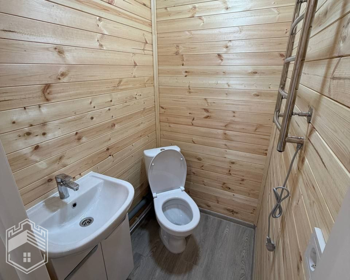 — Отделка: на пол уложен ламинат, на стенах — вагонка штиль, натяжной потолок, межкомнатные двери Прима вайт микс, в с/у кафель, установлены унитазы, ванна, раковины, зеркало и полотенцесушитель.