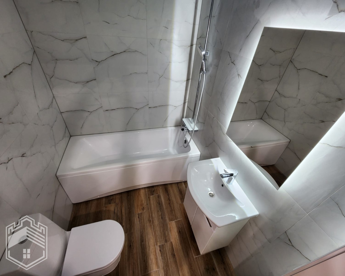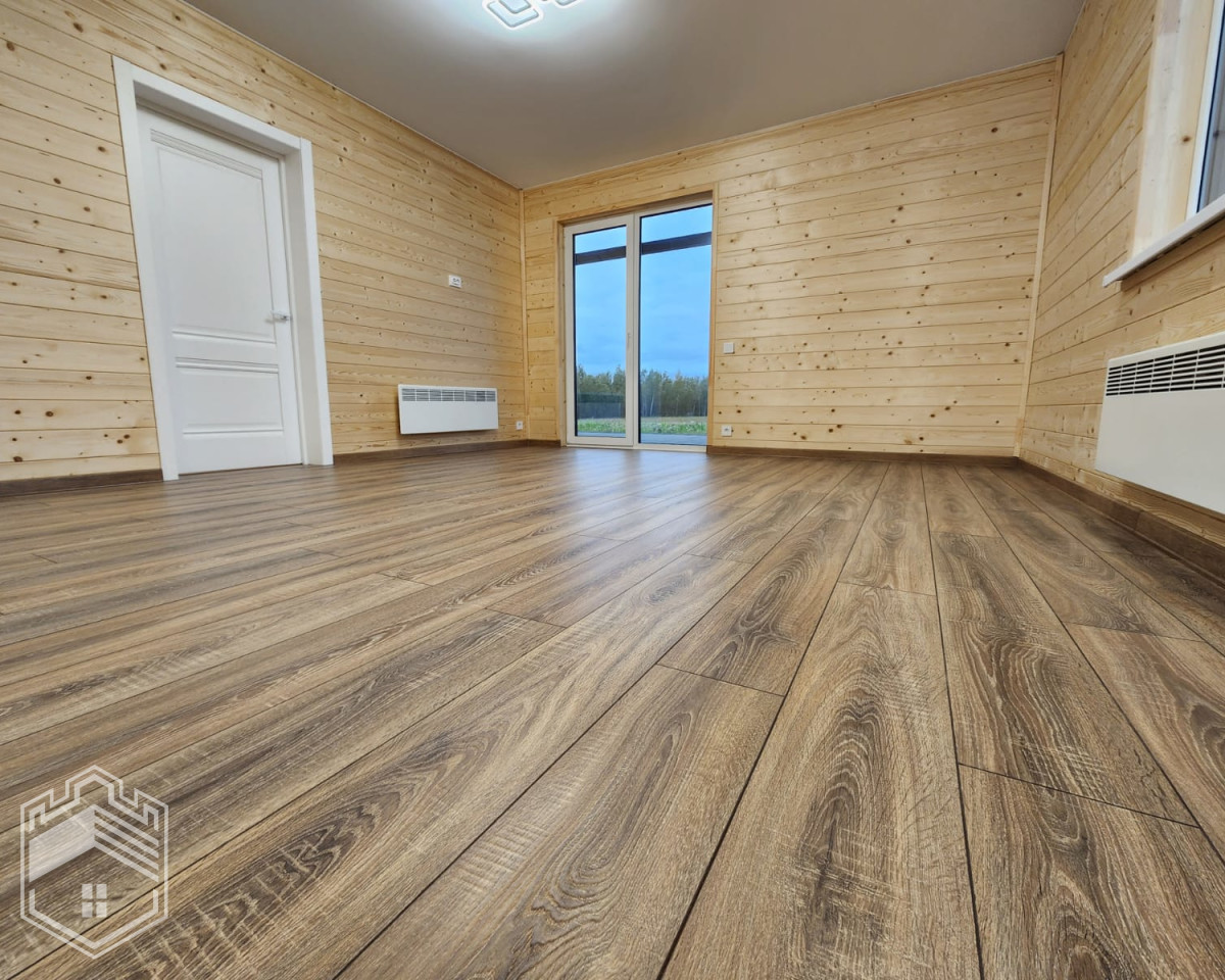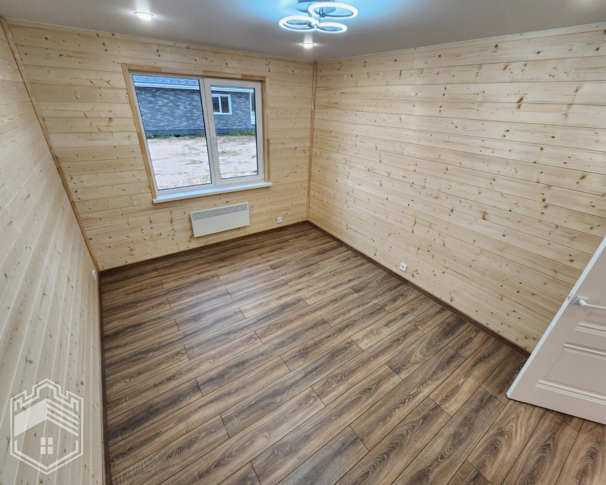 — Отделка: на пол уложен ламинат, на стенах — вагонка штиль, натяжной потолок, межкомнатные двери Экошпон, в с/у кафель, установлены унитаз, ванна, раковина, зеркало и полотенцесушитель.