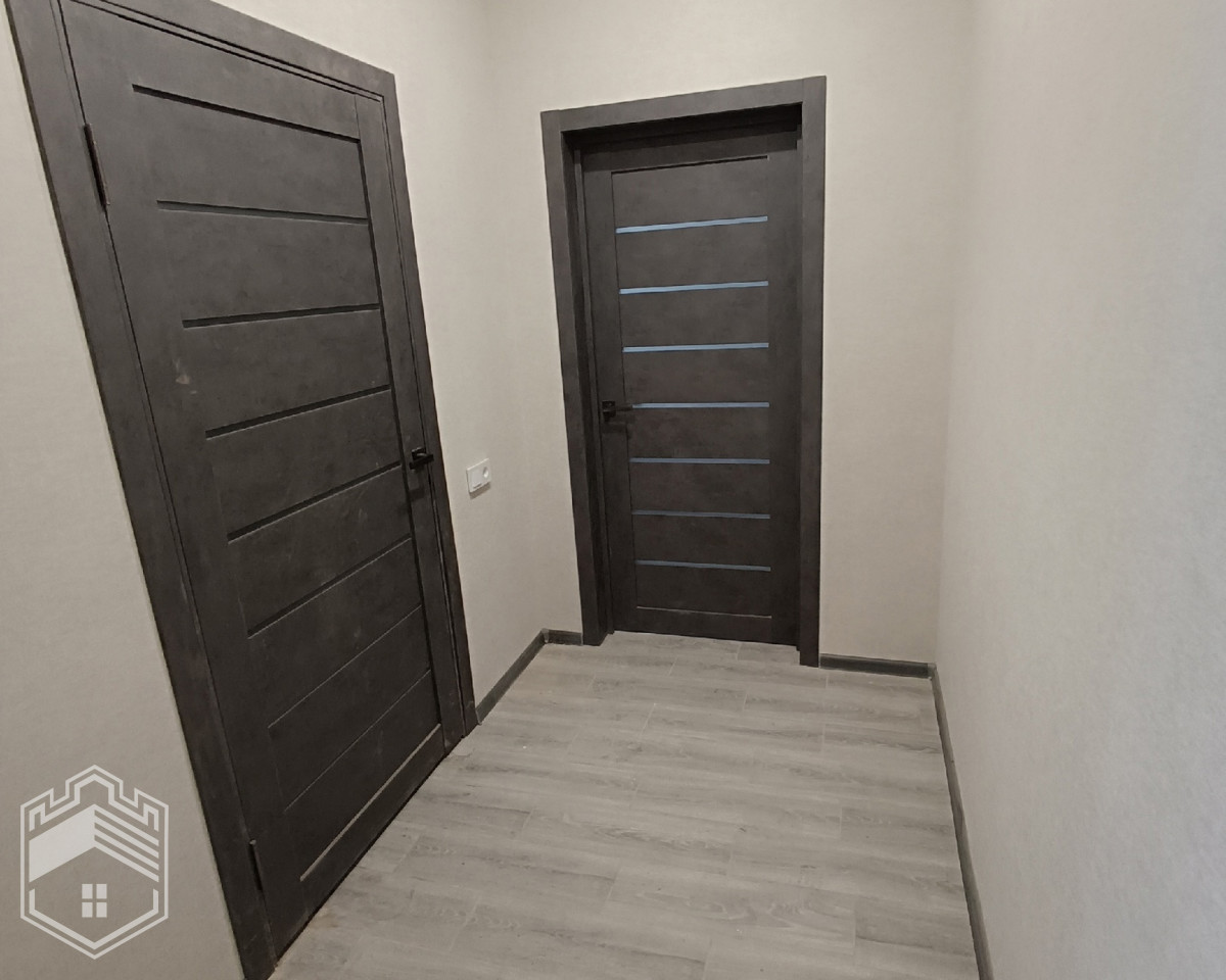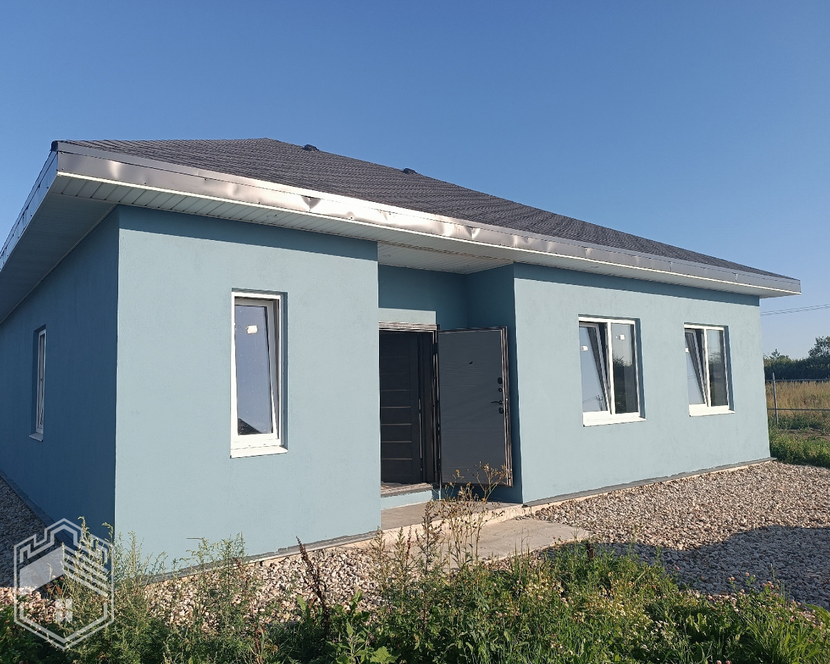 Дом — одноэтажный, материал стен — газобетон 400, оштукатурен, фундамент — плита 300, крыша — металлическая черепица, стеклопакеты. Полностью сделана внутренняя отделка. Дом под ключ.