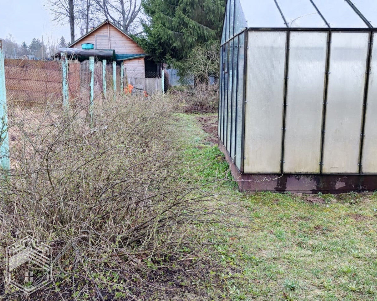 Участок — 12 соток, огорожен, частично разработан, есть баня, гараж, теплица, насаждения.