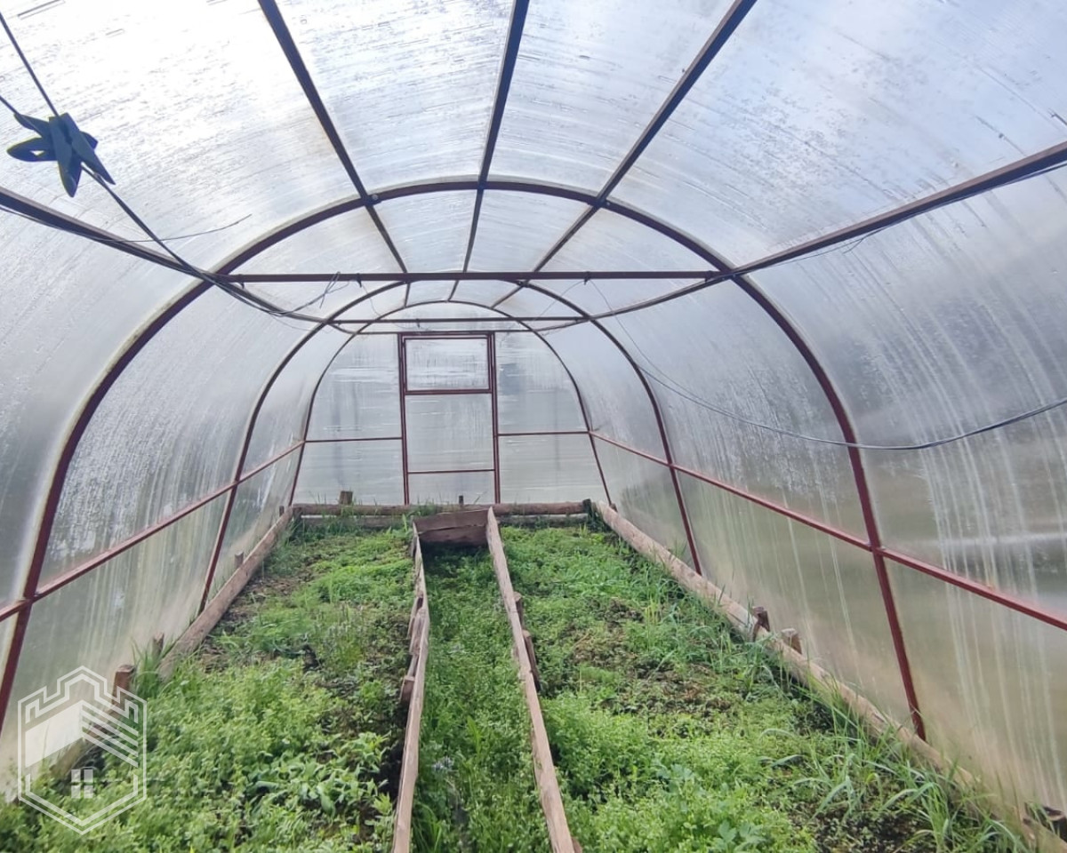 Участок — 10 соток, в собственности, огорожен, разработан, электричество 5 кВт, много насаждений, плодовые деревья, сделаны дорожки, теплица 6 на 3, пруд.