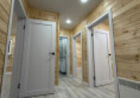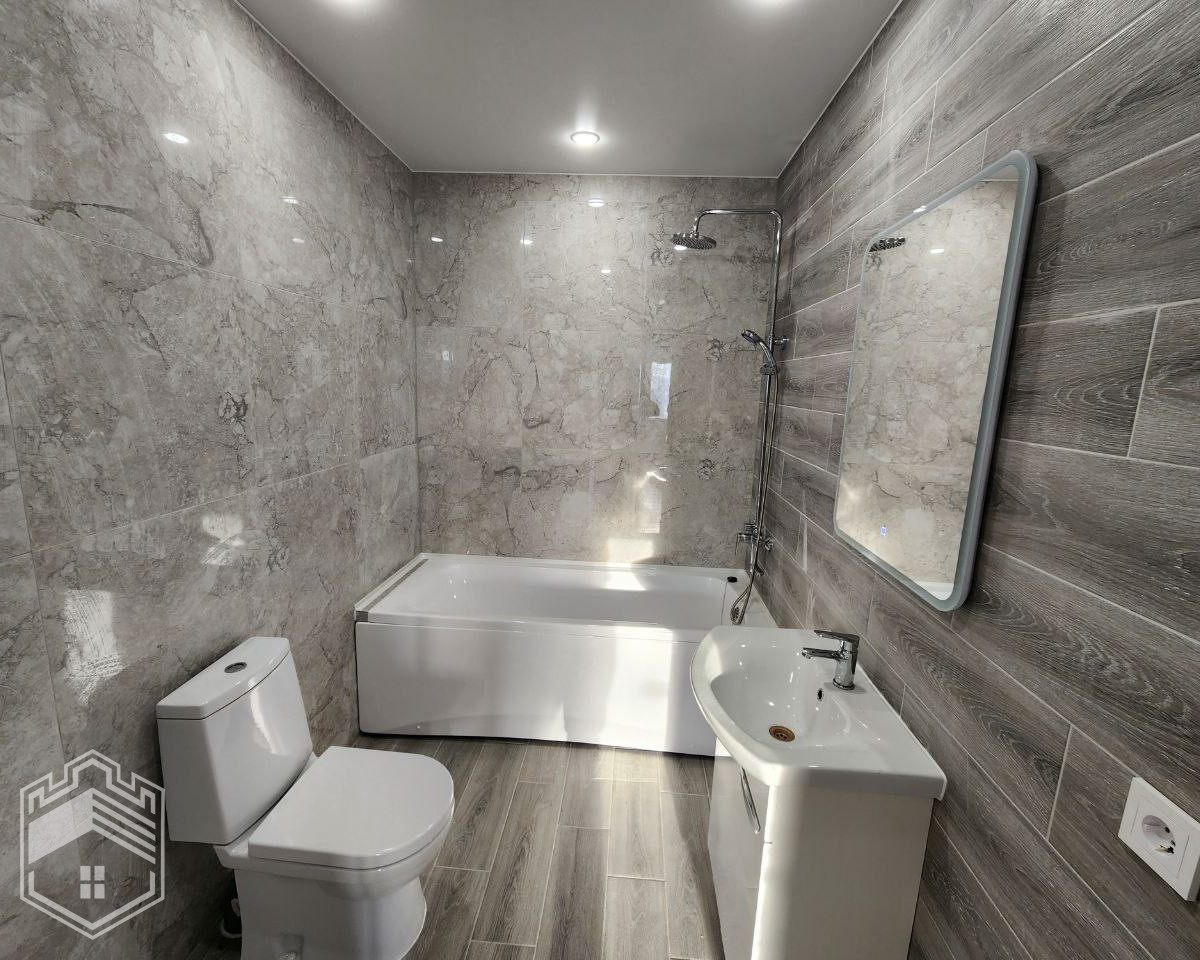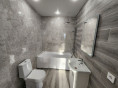 — Отделка: на пол уложен ламинат, на стенах — гипсокартон с подготовкой под обои, натяжной потолок, в с/у кафель, установлены унитаз, ванна, раковина, зеркало и полотенцесушитель.