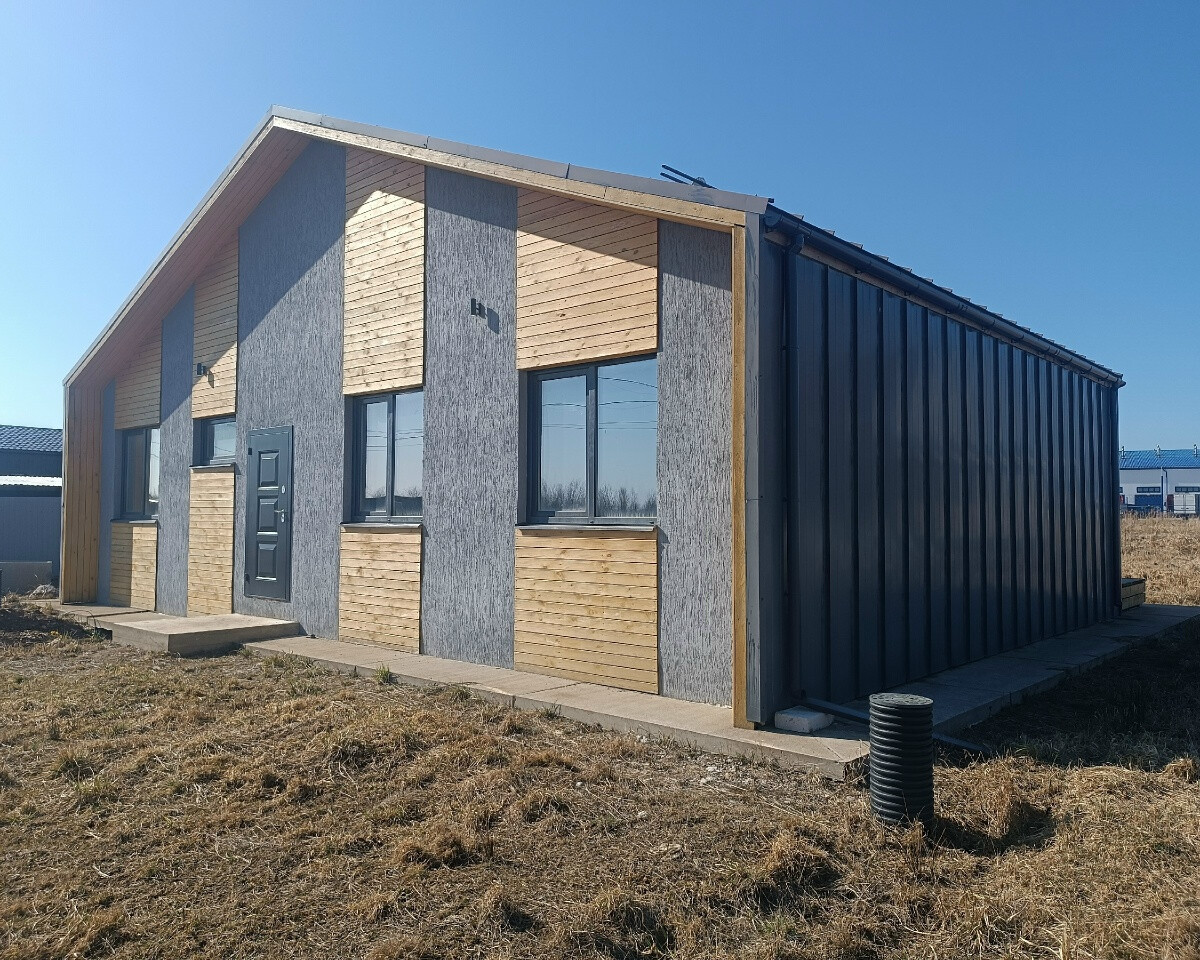 Дом — одноэтажный, под чистовую отделку, 132,8 кв.м, с террасой, блочный, оштукатурен с фасада, фундамент — бетонные сваи, обвязаны лентой, пол — сухая стяжка (подходит и под плитку, и под ламинат), гидроизоляция, сделана отмостка и водоотведение, стены и цоколь утеплены.