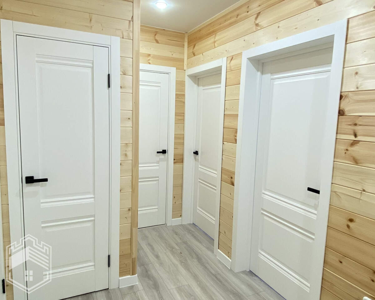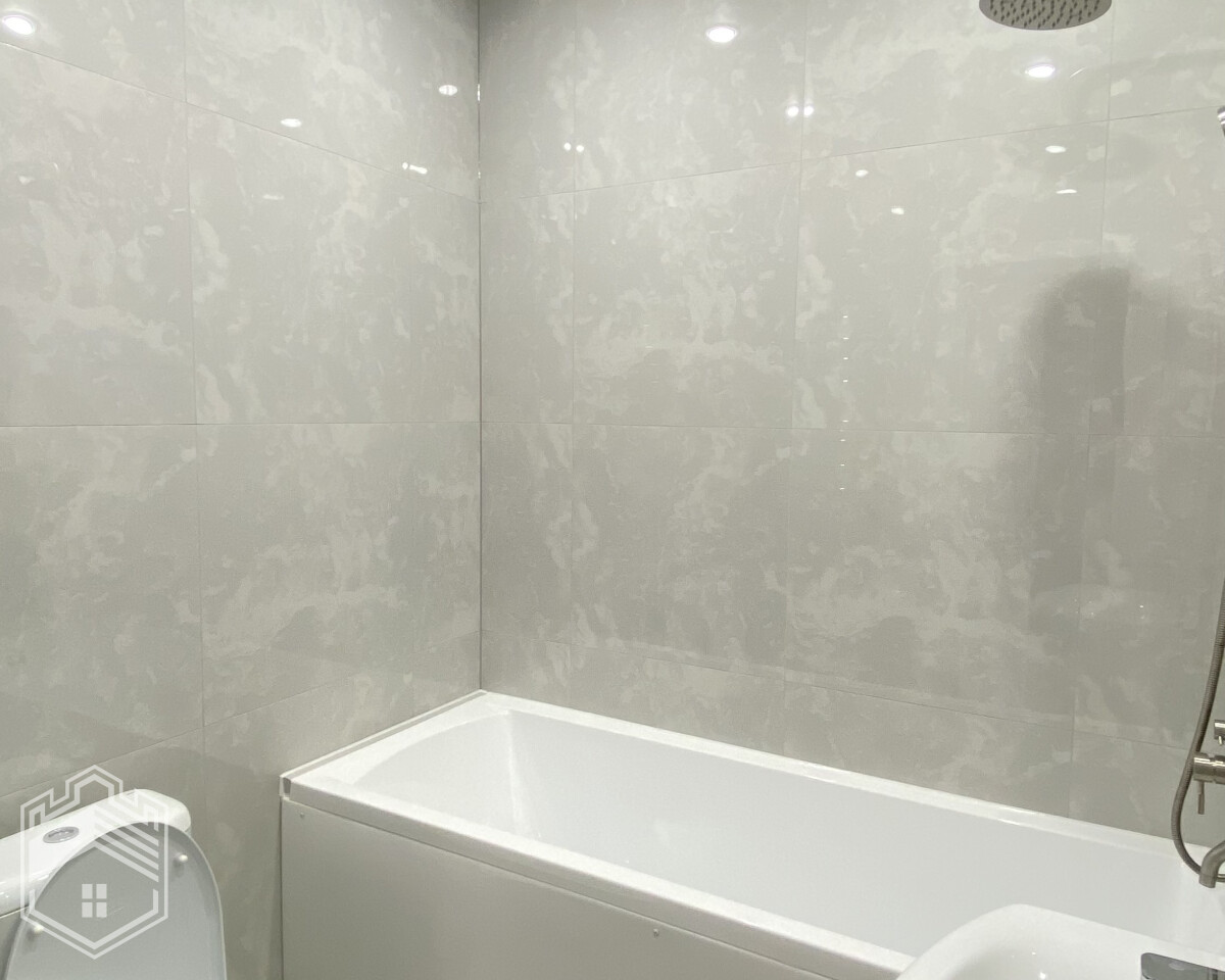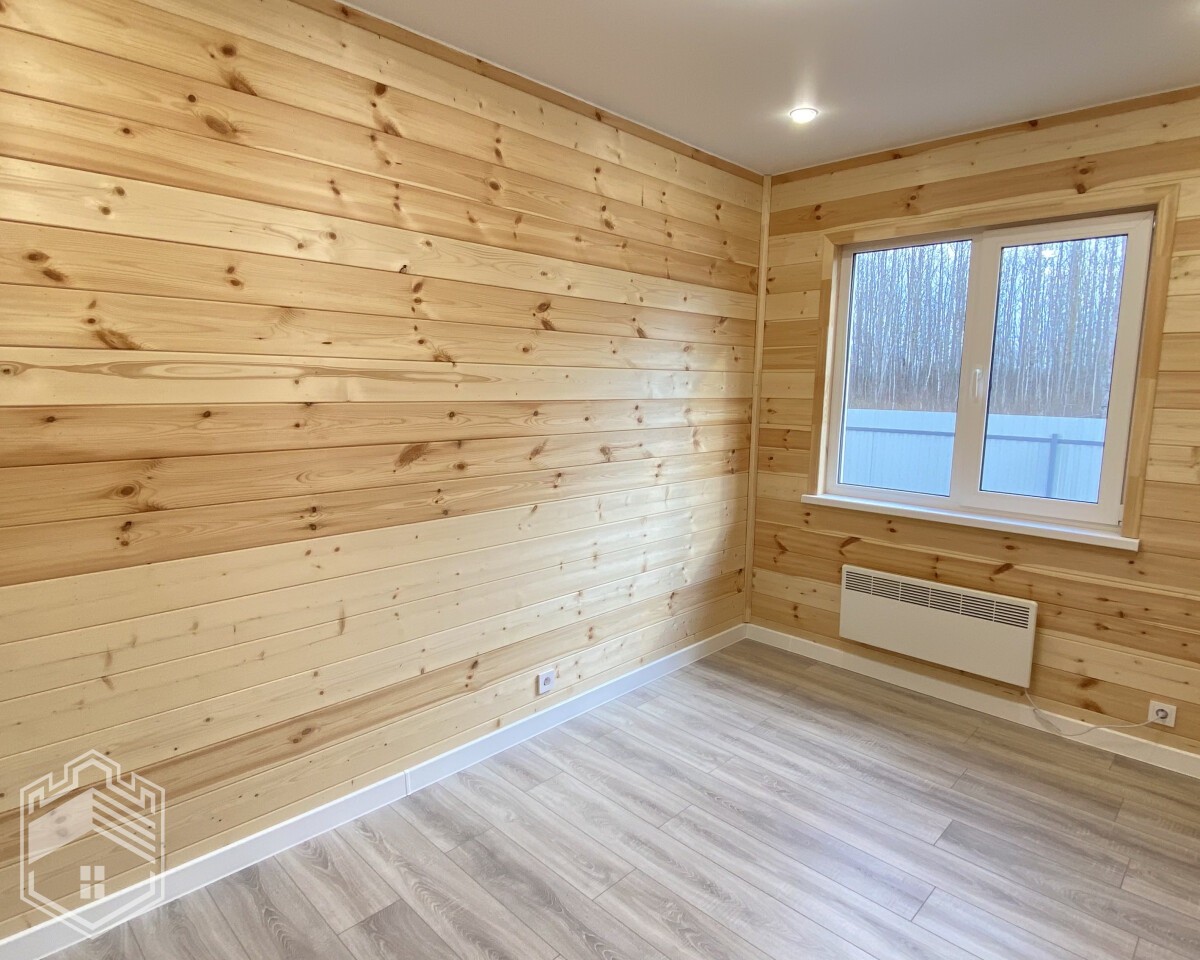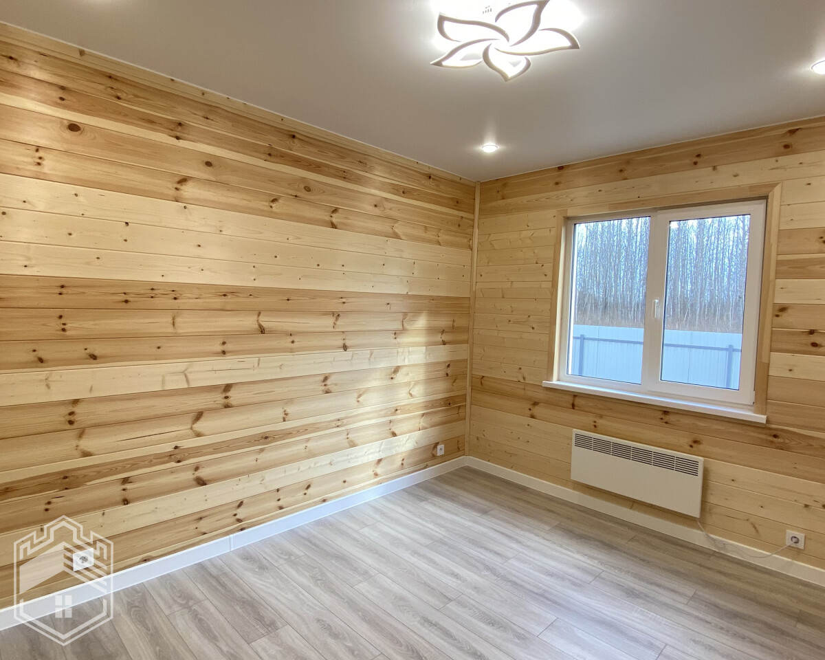 — Отделка: на пол уложен ламинат, на стенах — вагонка, натяжной потолок, межкомнатные двери Экошпон, в с/у керамогранит, установлены унитаз, ванна, раковина, зеркало и полотенцесушитель.